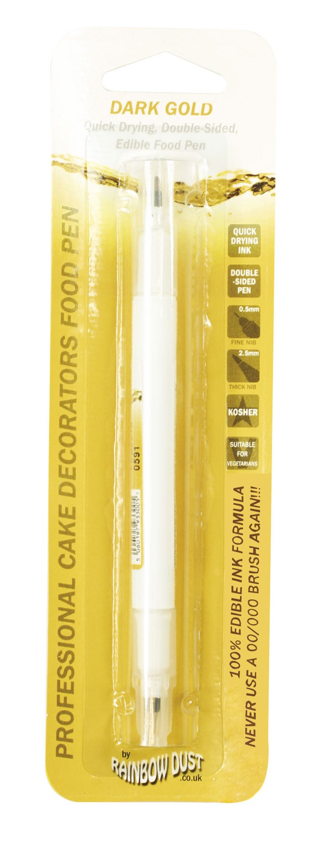 | Description | Rainbow Dust's food Pens are filled with edible ink. The Pens have a standard pen style 2.5mm nib which can be used for standard work and a fine 0.5mm nib for the fine detail such as adding facial features and intricate details. |