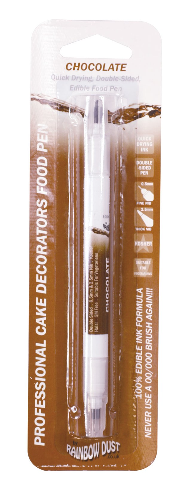 Rainbow Dust's food Pens are filled with edible ink. The Pens have a standard pen style 2.5mm nib which can be used for standard work and a fine 0.5mm nib for the fine detail such as adding facial features and intricate details.