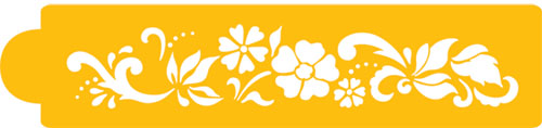 This is a beautiful side floral design that measures 2"H x 11"W or 27.5 x 5 cm. This stencil is made out of 10 mil, durable food-grade plastic.