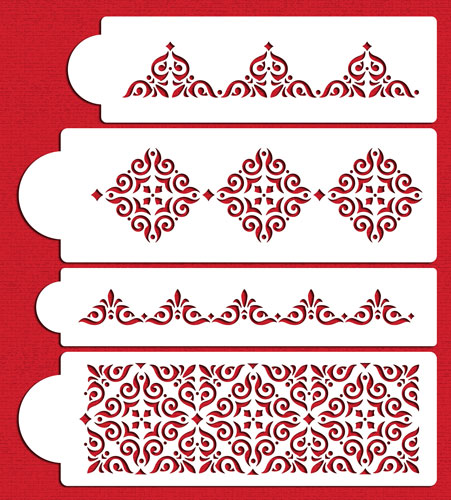 | Description | This beautiful Mexican Tile cake stencil set consists of four patterns as shown. The stencils are cut out of 10 mil, durable food-grade plastic. Apply onto cakes, cupcakes, cookies, and so on with royal icing, lustre dust or spray, and airbrush colors. The top tier measures 2"H x 10.6"W. The second tier measures 3.4"H x 11.9"W. The third tier measures 1.3"H x 12"W. The fourth tier measures 4"H x 12.1"W. |