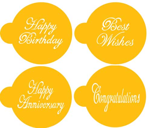 | Description | This is a set of four celebratory phrases which include: HAPPY BIRTHDAY - BEST WISHES - HAPPY ANNIVERSARY - CONGRATULATIONS. All of these stencils are in the script font and fit within a 4" circle. These stencils are made of durable 10 mil food grade plastic for high-quality, professional, repeat use. |