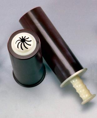 Made of plastic. Just insert cookie dough and push on baking tray. Not suitable for hard cookie dough.