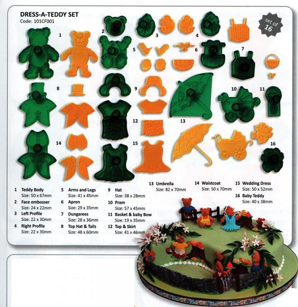 Plastic cutter and embosser consist of 16 cutters to dress a teddy. Either to make a male teddy until making a baby teddy.