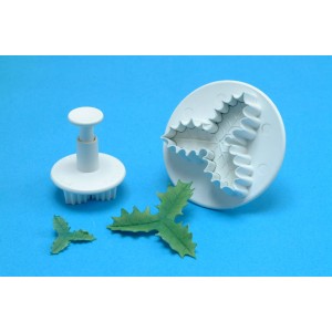 PME Three Leaf Holly set of 2 Plunger Cutters. Made from durable plastic and easy to clean. Use with all sugarpaste fondant. Size 25mm (1in) 45mm (1 3/4in).