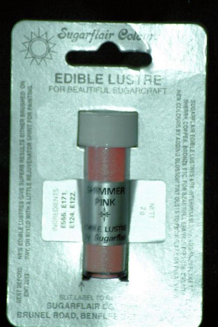 | Description | Lustre Colours can be brushed or painted over dry sugar work. Brush dry over flowers, butterflies, cars, crowns, jewels or cut out decorations for a delicate lustre sheen. If you require a richer colour, apply a very thin coat of Alcohol first. Edible lustre dusting powders in 2 gr vials. |