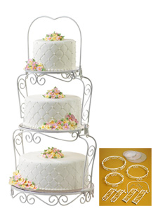 The three-tiered, scrollwork stand features crystal-clear plates which nest securely in each section. Ideal for garden-themed wedding cakes, but also perfect to display cupcakes, muffins, candies, fruit and more.