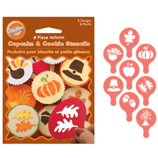 Turn plain treats into visions of the season with a stenciled Autumn design. Just place one of the fun designs over your baked treats, then sprinkle away with Wilton Cake Sparkles or Color Sugars. Also great with Color Mist Food Color Spray. 8 designs.