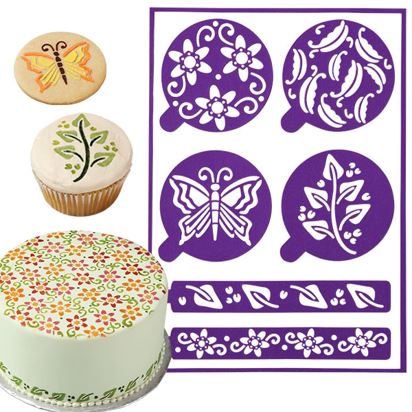 With four round cupcake-size designs and two linear designs, you can use them to decorate cookies and cupcakes; since they're easy to reposition, you can even use them to stencil on the sides and top of a cake. Stick-N-Stay stencils work well on fondant and Color Flow and royal icing. It attaches to Candy Melts candy so you can decorate your candy-topped creations as well. You can stencil with so much variation – use Pearl Dust edible accents or Color Dust edible accents or Color Mist food color spray to add color to the designs or create designs by applying melted candy, thinned royal icing or tinted buttercream icing to fill in the stencil openings. The tabs on each stencil make it easier to position and to remove after use. Four round nature-inspired patterns range from large butterfly and branch to all-over leaf patterns and flower designs perfect for covering surfaces large or small. Linear designs include a border of blossoms and of leaves. Round designs are perfectly sized for the top of a cupcake or cookie at 2.5 in. (6,35 cm) dia.; linear designs measure approx. 5 in x .75 in. (12,7 cm x 1,9 cm).