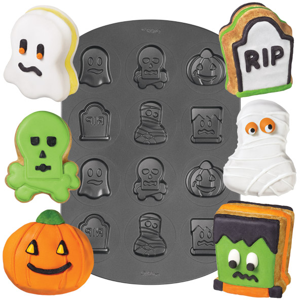 Create your own creepy sandwich cookies for Halloween! Includes 6 designs: tombstone, monster, ghost, mummy, pumpkin and skull Non-stick for easy release Delicious cookie recipe on back Dishwasher safe