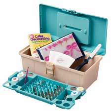 | Description | We've put together the perfect set for both beginning and advanced decorators. The generous selection of tips, colors and tools gives you the flexibility to decorate virtually any kind of cake. The handy caddy also has plenty of room to add new items and keeps everything organized to save you time. Set includes all tools specified as needed in our Course 1 class. Includes: Standard Round Tips #2, 3, 5, 7, 12; Standard Open Star Tips #16, 18, 21, 32; Standard Basketweave Tip #47; Standard Leaf Tip #67; Standard Petal Tips #101, 103, 104; Drop Flower Tips #133, 225; Multi-Opening Tip #233; Leaf Tip #352; Tip #2004 (2D), No. 7 Flower Nail; 18 Disposable Bags; one 10 in. Soft Touch Bag; Tip Brush; Decorator Brush; two Standard Couplers; 8 in. Angled Comfort Grip Spatula; four .5 oz. Icing Colors: Lemon Yellow, Christmas Red, Royal Blue, Leaf Green; Practice Board; New Cake Decorating Beginner's Guide. |