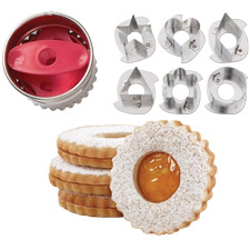| Description | Make European-inspired jam-filled cookies for a fun holiday treat. Fluted cookie cutters have six interchangeable center shapes that let the filling show through. Fluted round cookie cutter has six interchangeable center shapes: star, heart, diamond, triangle, flower, and circle. |