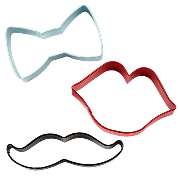 | Description | With the Wilton 3-Pc. Colored Metal Cookie Cutter Set, you can make perfectly shaped bow tie, mustache and lips cookies every time.