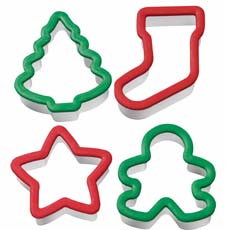 | Description | Safe, easy cutting, with a comfortable grip and deep plastic sides. Mesh bag for convenient storing and giving. Four shapes include stocking, tree, star and gingerbread boy. Each approximately 3 1/2 in. |