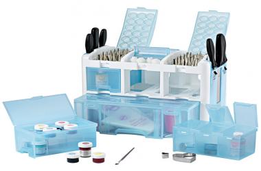 Two slide-out drawers feature 3 compartments with snap-open tops. The perfect space for Fondant Cut-Outs, stamens, flower nails, decorating bags, candles and more. Icing color drawer holds up to 24 - 1/2 oz. jars or 10 each 1 oz. and 1/2 oz. jars.