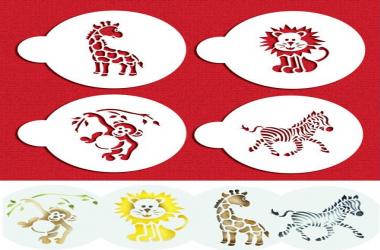 Description Adorable baby jungle animals for cookies! Zebra, Giraffe, Monkey and Lion - great for a little one's birthday party. Each animal cookie stencil fits just within a 6.9 cm circle so perfect for >7.62 cm cookie. Made from durable food grade plastic for repeated use.