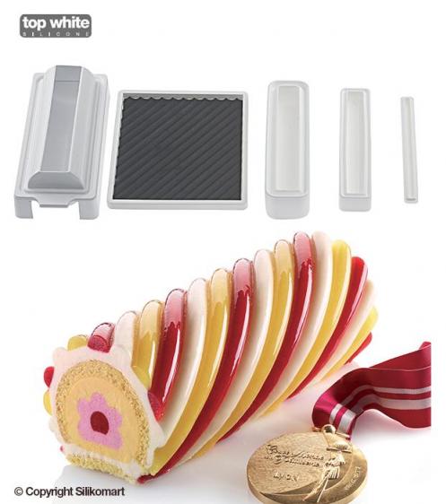 -60°C (-76°F) and +230°C (+446°F) Kit Ali di Fata is composed by items: 1. Combinable silicone molds to make a surprising effect of inserts with floral theme. 2. A silicone mat characterized by a wavy weave and a silicone base to reproduce multi taste and multi color strips. The same base can be used to make the sponge cake. 3. Two thermoform items that make easy the assemble of the entremet. Size: 90 mm x 250 mm x h 85 mm Vol.:1400 ml |