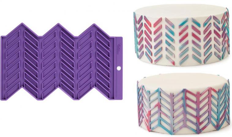 | Description | Make detailed cake decorations using the Herringbone Fondant Onlays Silicone Mold. This flexible silicone mold makes it easy to achieve greater detail in less time. Simply press fondant into mold to create precise patterns. Remove interior or exterior fondant pieces for desired look. Press to cake and peel back mold to apply the design to the sides of cake. Use interior sections to mold individual shapes or mold cutout style pattern.