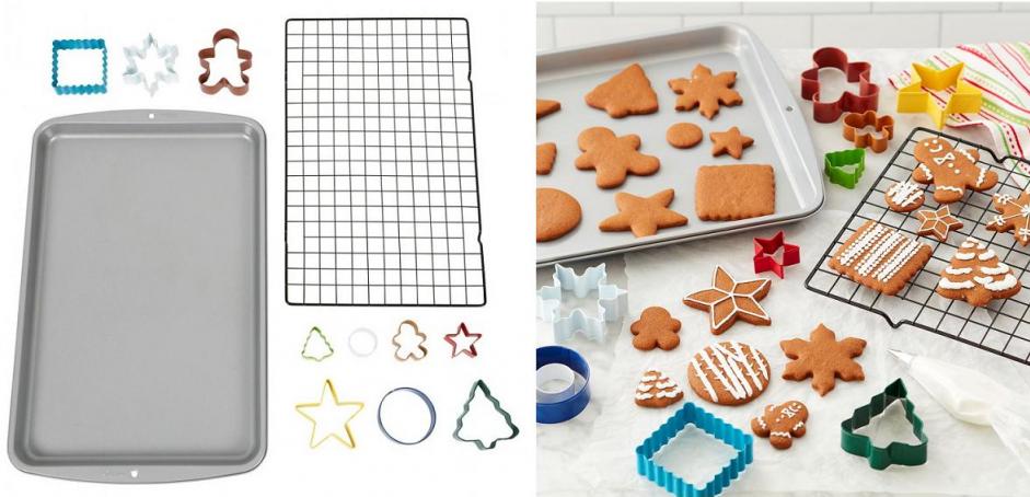 Description Baking lots of holiday cookies is more fun when you've got all the right tools. This set has just what you need to get started, including a large non-stick cookie sheet, cooling grid and 10 metal cookie cutters in jolly holiday shapes. This cookie baking set is a must-have for your cookie exchange baking this season! Shapes include: Large and small circles, large and small Christmas trees, large and small stars, large and small gingerbread men, snowflake, and square with scalloped edges.