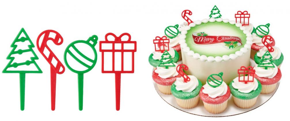 These Holiday icon DecoPics are a great addition to your dessert display. Assortment includes green trees, red candy canes, green ornaments, and red presents. Great for cake and cupcakes to add to an overall theme. Made with food-safe plastic.