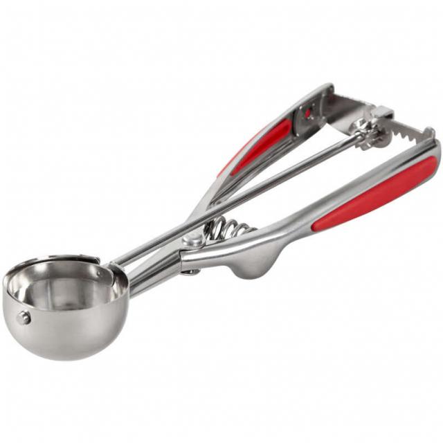 | Description | Holiday cookie baking just got easier with this stainless steel cookie scoop. It helps make your cookies more uniform for even baking. Festive red grips make use more comfortable. It has a 4 teaspoon capacity and a squeeze handle for easy release of dough.Specifications: