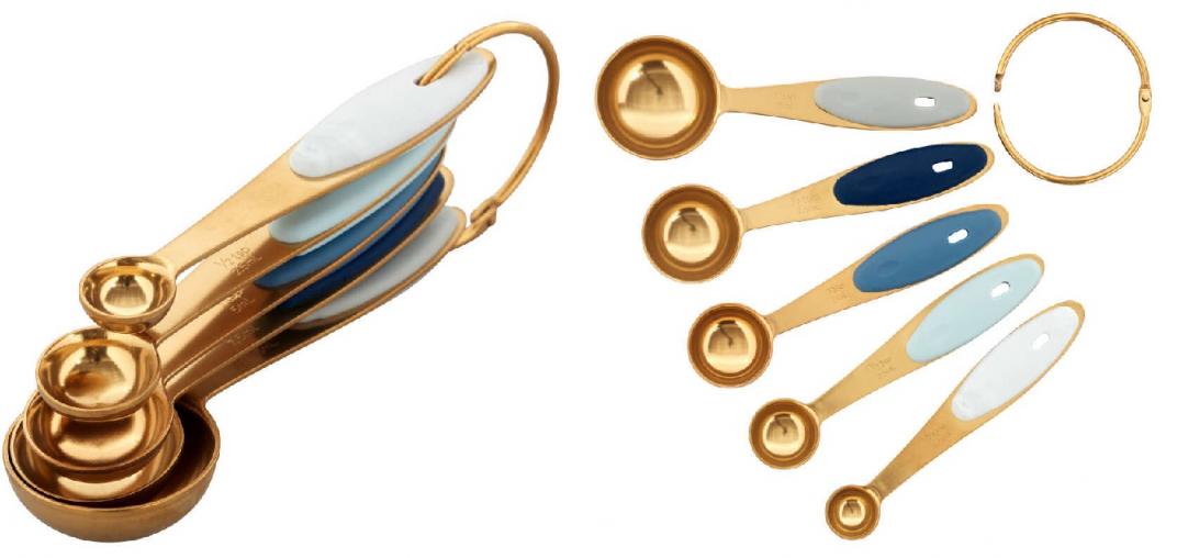 | Description | The kitchen is the heart of your home. Not only should it be functional, but it should also reflect your personality. Sleek and stylish, these modern Wilton navy and gold nesting measuring spoons are a great addition to your cooking and baking collection. The navy and gold colors compliment a number of kitchen designs, and these measuring spoons nest for easy storage and organization. Each measuring spoon also features a silicone grip for added support and stability and engraved measurements. A snap-on ring holds them all together so you can store these spoons nesting in a drawer or hanging from a hook. Includes tablespoon, 1/2 tablespoon, teaspoon, 1/2 teaspoon and 1/4 teaspoon. Specifications: