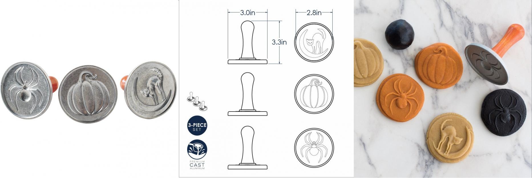 features spider, pumpkin and Halloween cat textured stamps. Use & Care: 1. Apply a light coat of oil to each stamp using a pastry brush or