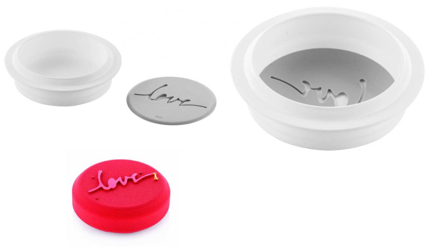 Kit Love 360 allows you to make a 360 ml cake for two persons, perfect for Valentine's Day. The kit consists of a mold and a silicone mat that is placed inside the mold to create an entremet with the word love written on it.