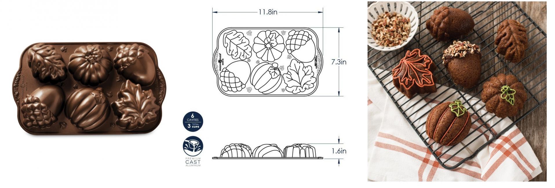 | Description | Leaves, pumpkins, and acorns adorn this charming little pan. From cakes